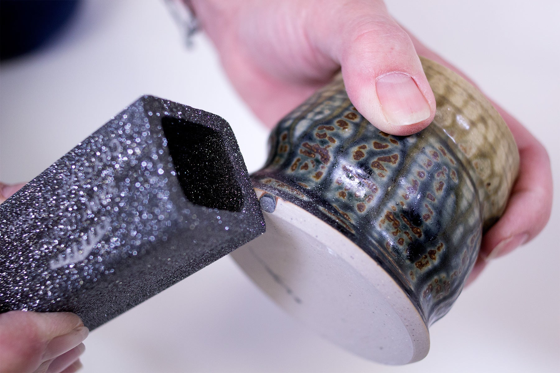 Handheld recrystallized silicon carbide grinding tool for smoothing pot bottoms and cleaning Advancer® kiln shelves.