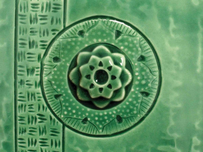This 100% mixable celadon glaze is a cool, glossy emerald green that pools and accents textured ware like the ancient glaze it is created to imitate.