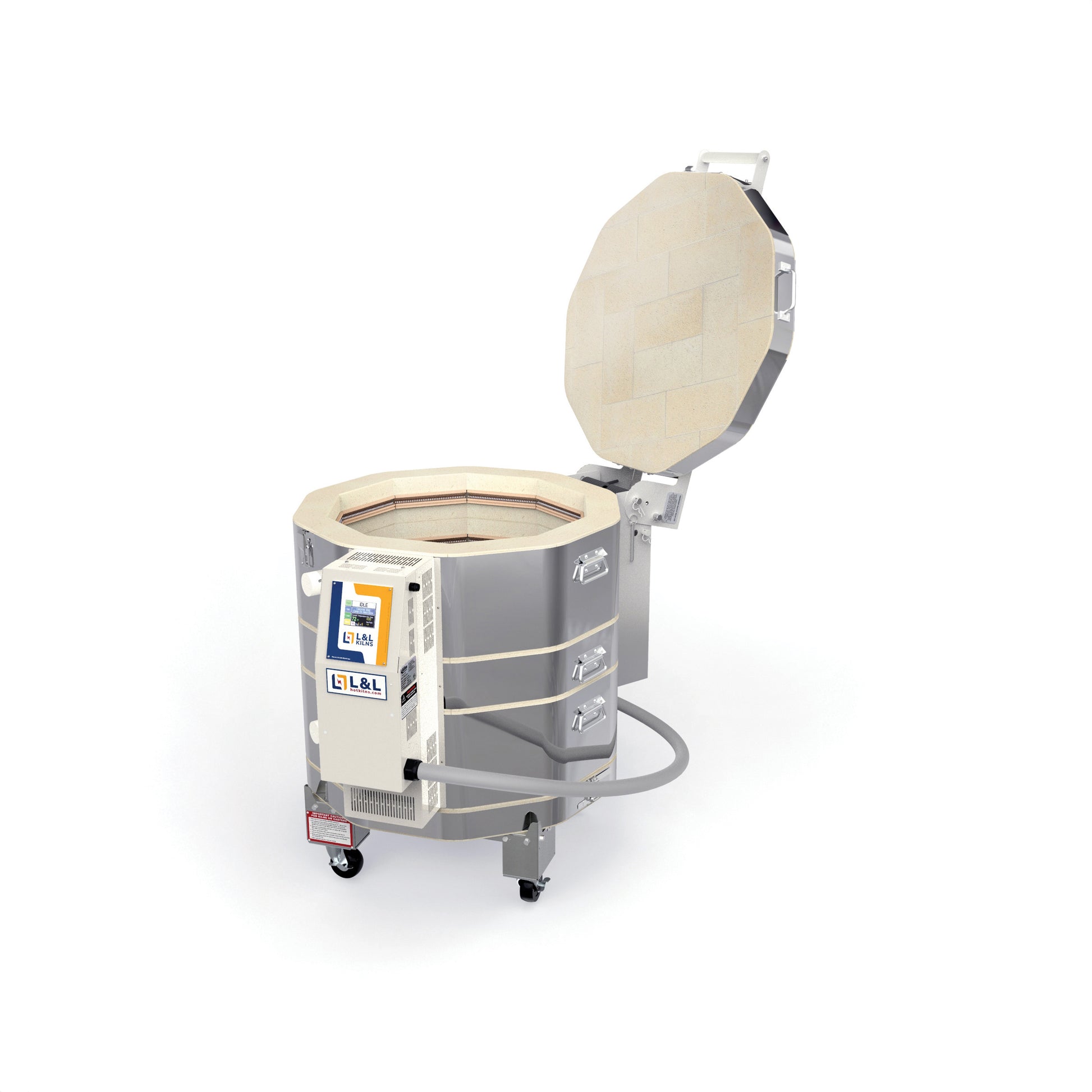 Model e23M-3 Easy-Fire Automatic Kiln with Multi-Program Two-Zoned Genesis Touchscreen control mounted in an easy-open, cool-firing, piggyback control panel that is angled for easy viewing of control. Kiln comes with hard ceramic element holders, protected thermocouples, a strong solid-top stand, an easy-lift spring hinge, and solid peephole plugs. 22-3/8" diameter by 22.5" high (5.5 cubic feet). 3" K23 brick. NEMA 6-50 single phase or 15-50 three phase 6 foot power cord included. C-MET-us listed in the USA & Canada. Cone 10 for all voltages. There are two thermocouples. No charge for 3-phase versions.