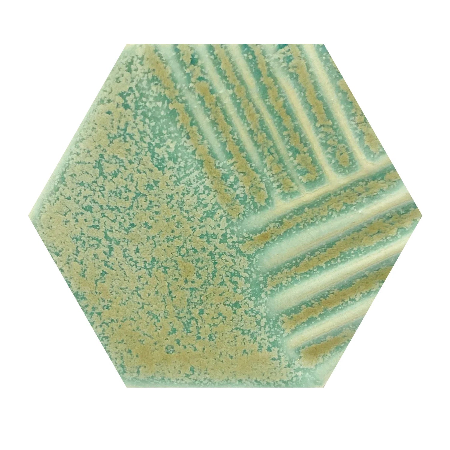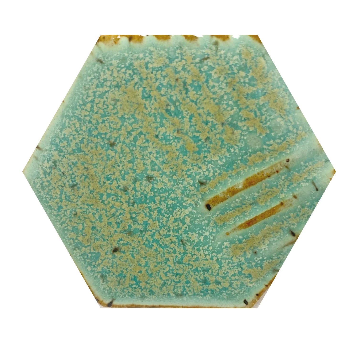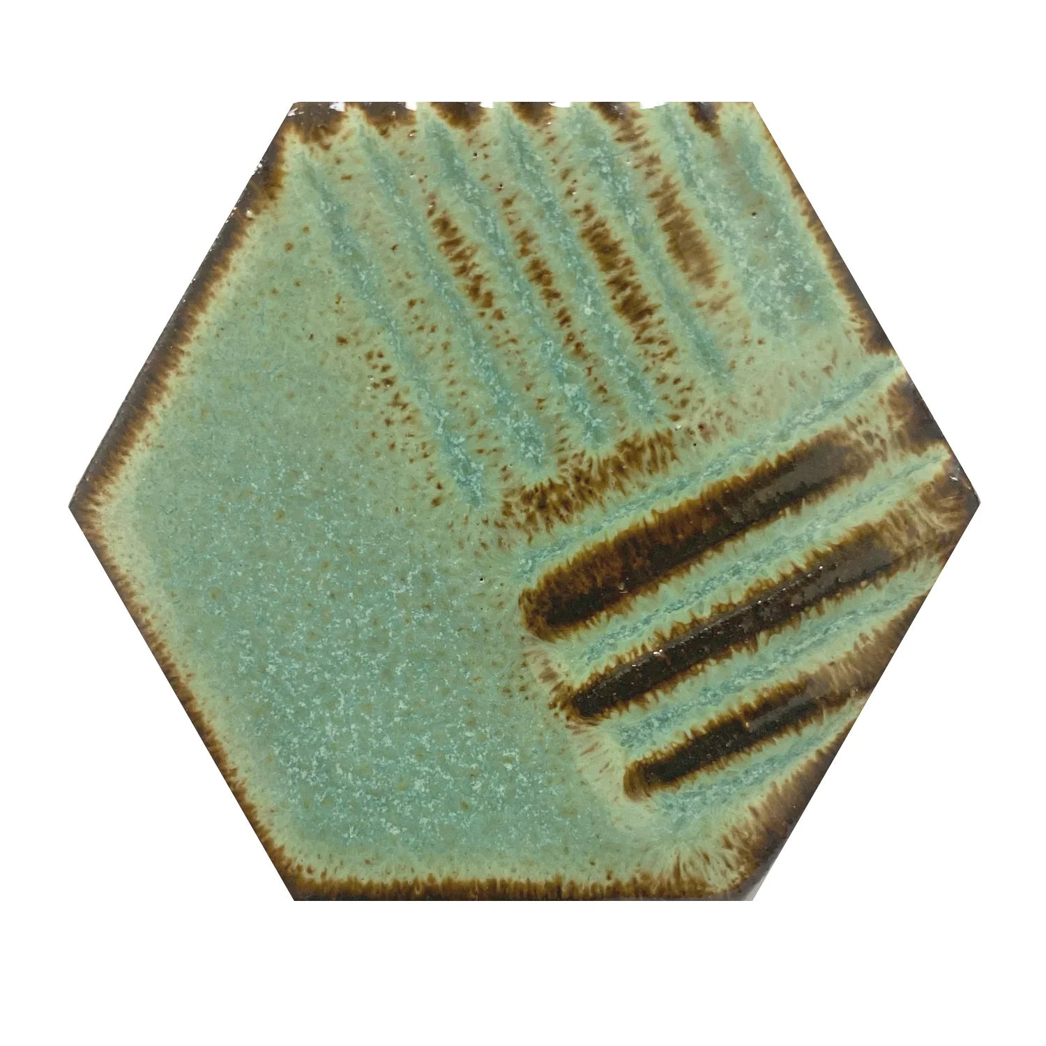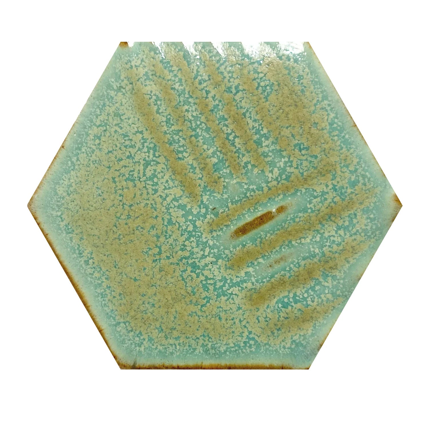 This glaze is a beautiful green variegated glaze with tiny tan veins. It is opaque and layers well with others. Needs to be thick and fired to a full cone 6 to reach its potential. If fired at cone 5 it is a beautiful white with a hint of satin.