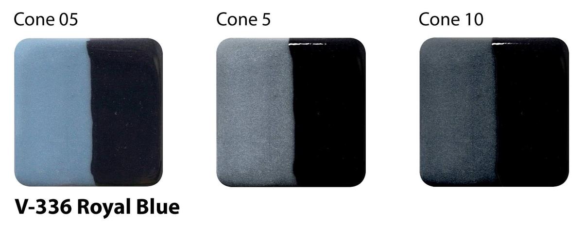 Royal Blue Velvet Underglaze is a navy blue that is deep and saturated at cone 05, darkens at cone 5, and becomes almost black at cone 10. A clear glaze deepens the color of the underglaze significantly at any temperature.